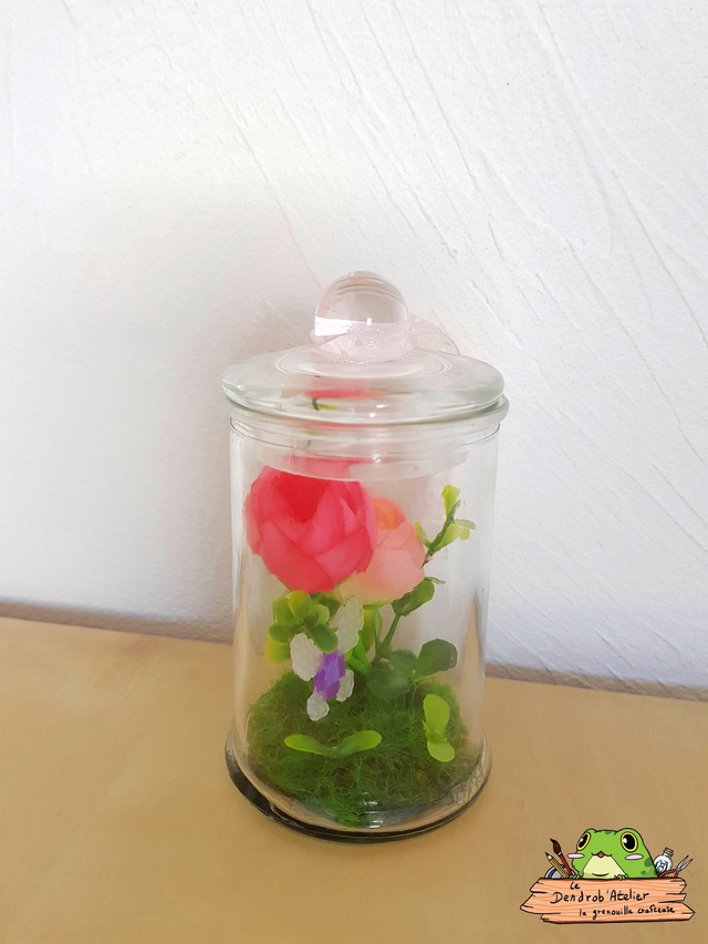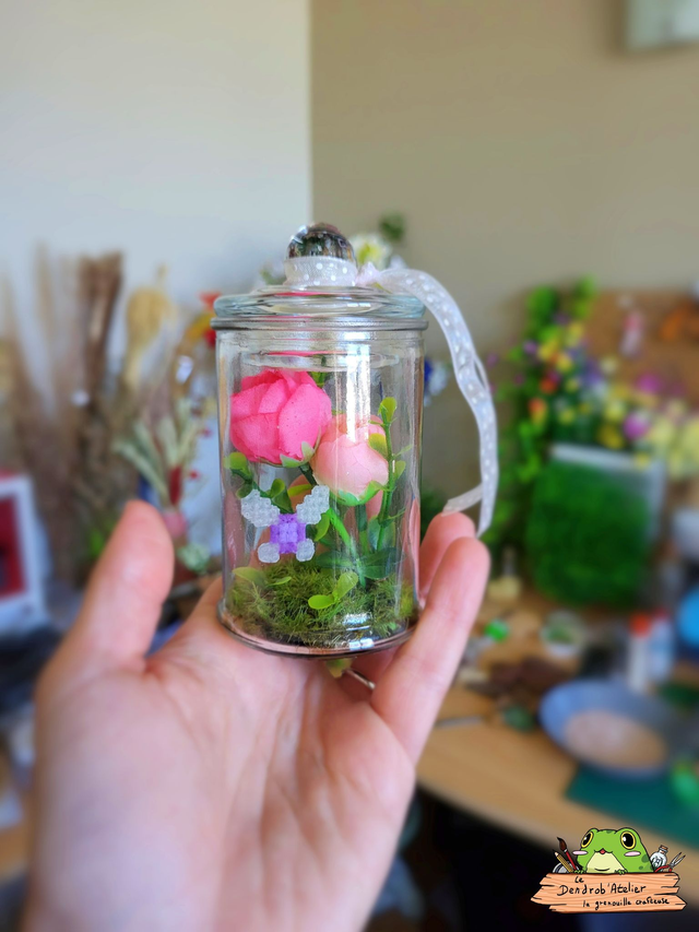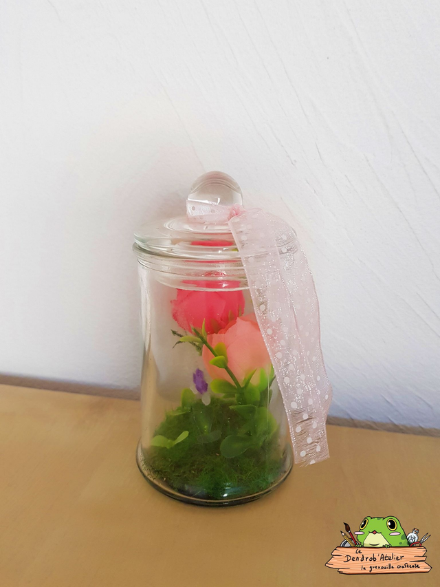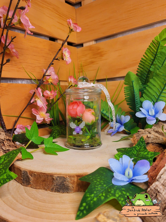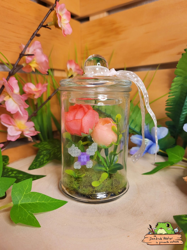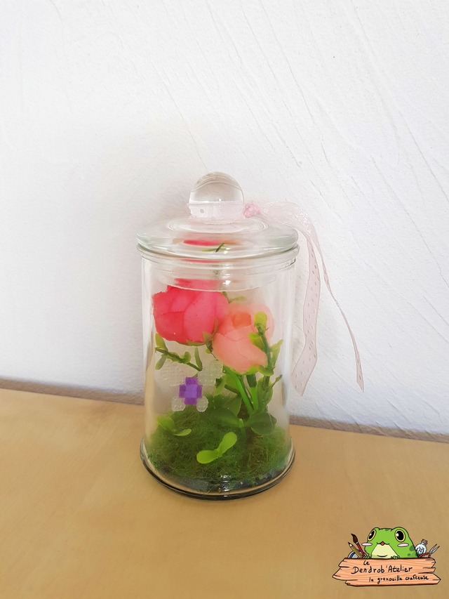 Création en perles Hama dans une petite bonbonnière en verre ornée d'un ruban, décor de plantes artificielles. Le couvercle de la bonbonnière n'est pas scellé.