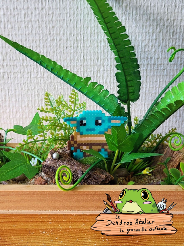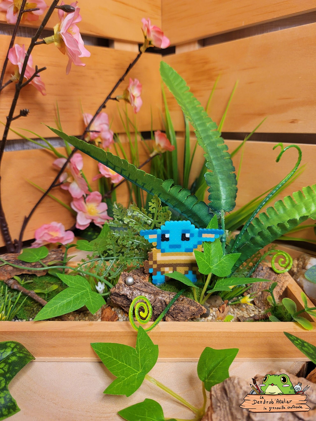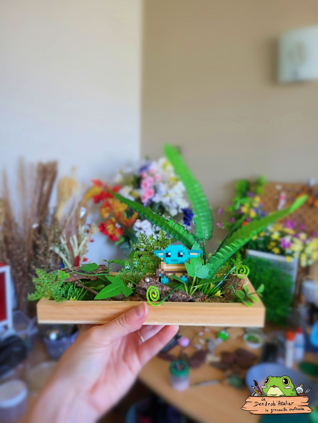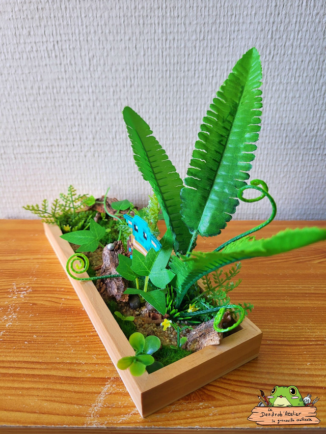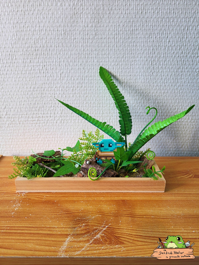 Création en perles Artkal dans une sphère en verre, décorée de gravier, de cailloux, d'écorce et de plantes artificielles.
