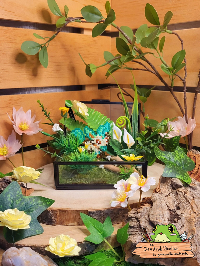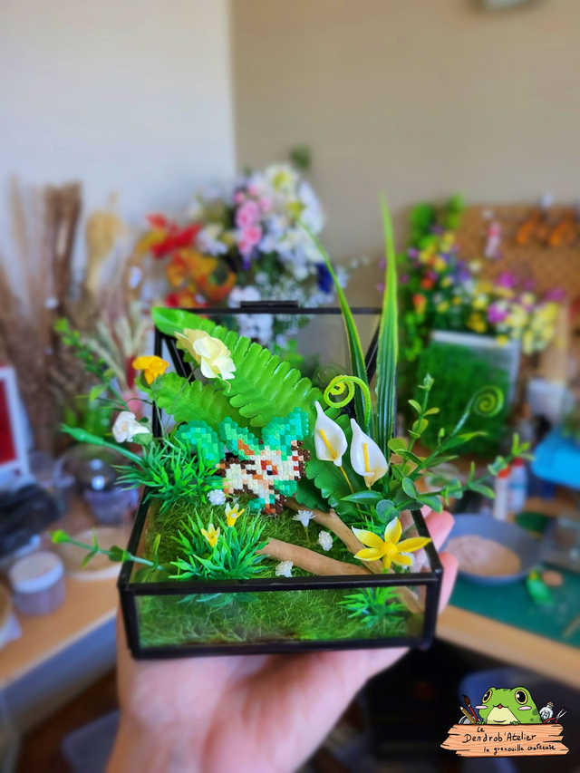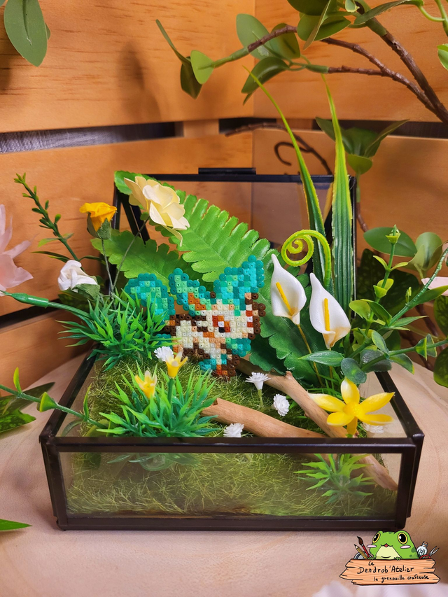 Création en perles Hama, décor de plantes et fleurs artificielles et bois flotté dans un écrin en verre et métal (bloqué ouvert).